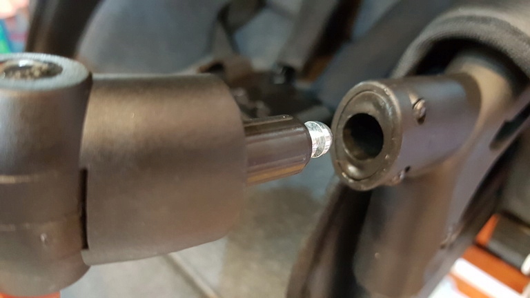 Barierka posiada szybki system wpinania "click". Aby ją zamontować, wystarczy wsunąć końcówki w gniazda znajdujące się po bokach siedziska spacerowego, aż do usłyszenia charakterystycznego kliknięcia.