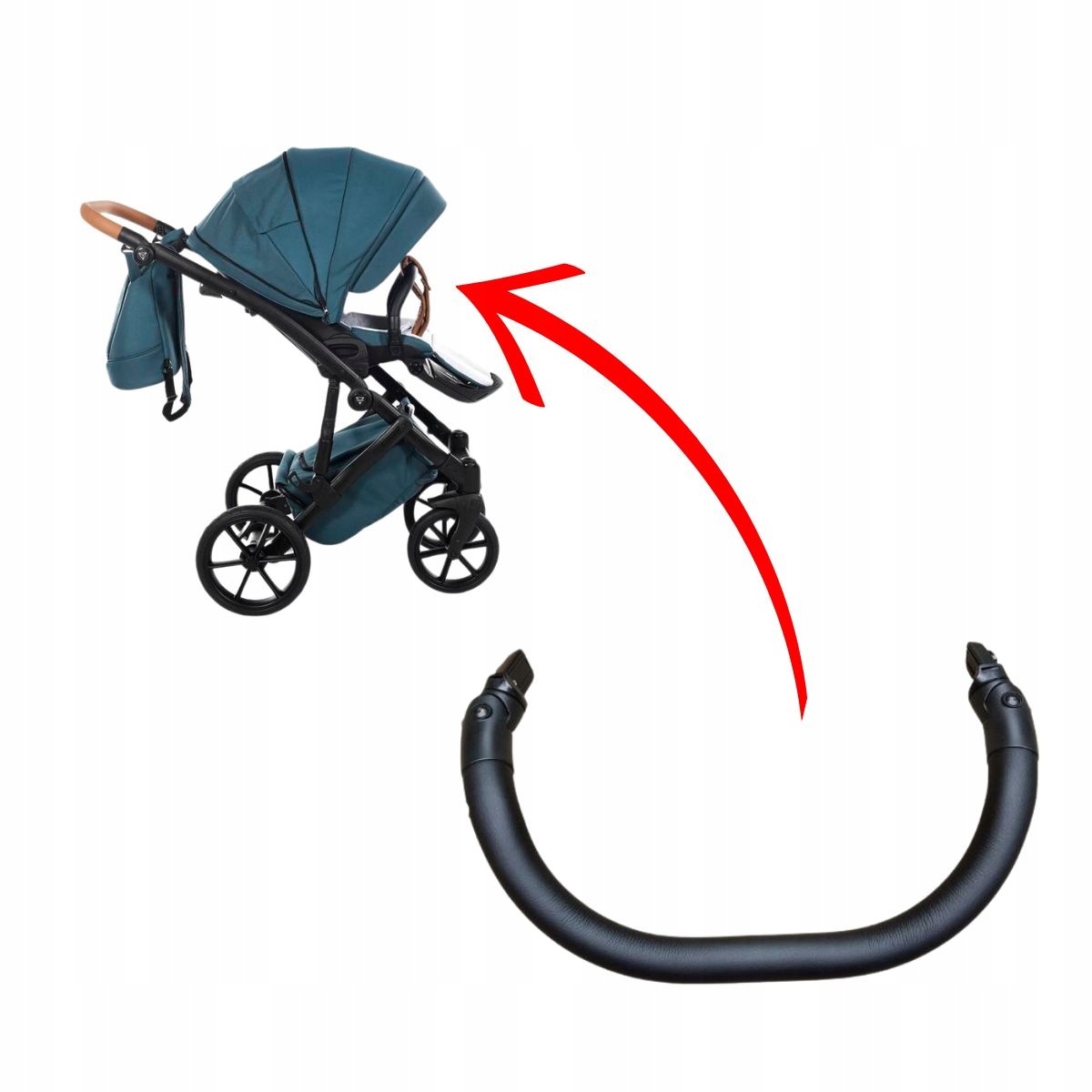 Jest to wersja V2, przystosowana do nowoczesnych spacerówek plastikowych, które składają się razem z podwoziem. Wykończenie z wysokiej jakości **czarnej ekoskóry** zapewnia elegancję, a miękkie wypełnienie gwarantuje dziecku bezpieczeństwo i wygodne oparcie dla rączek.