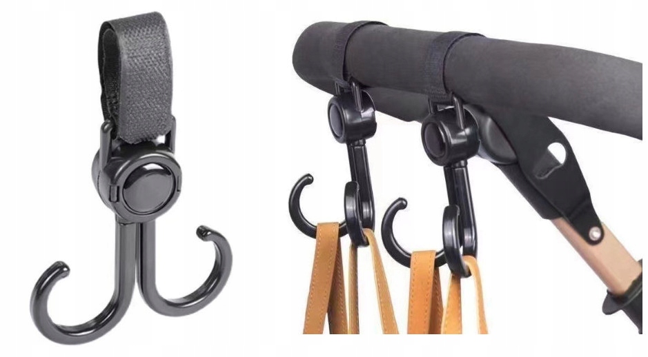Wykonane z trwałego tworzywa i wyposażone w solidne rzepy typu **Velcro**, gwarantują stabilność nawet przy większym obciążeniu. Pełny obrót 360° sprawia, że dostęp do zawieszonych rzeczy jest zawsze łatwy, niezależnie od pozycji rączki wózka.