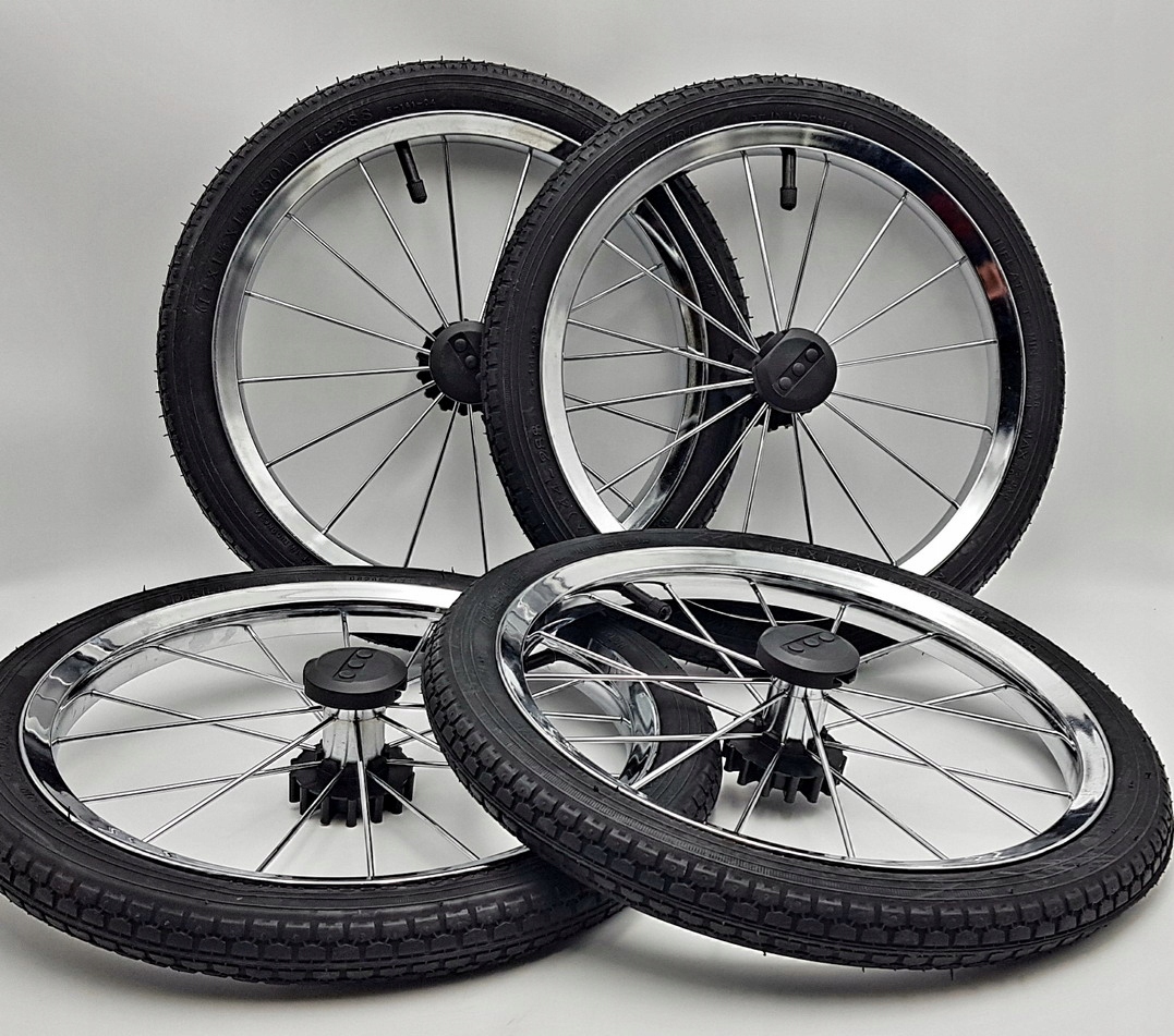 Oferujemy komplet 4 pompowanych kół o imponującej średnicy 36 cm, zaprojektowanych specjalnie dla tradycyjnych wózków retro. Ich klasyczny wygląd z chromowaną obręczą idealnie podkreśla linię modeli takich jak Roan Coss Classic czy Tako Dalga.