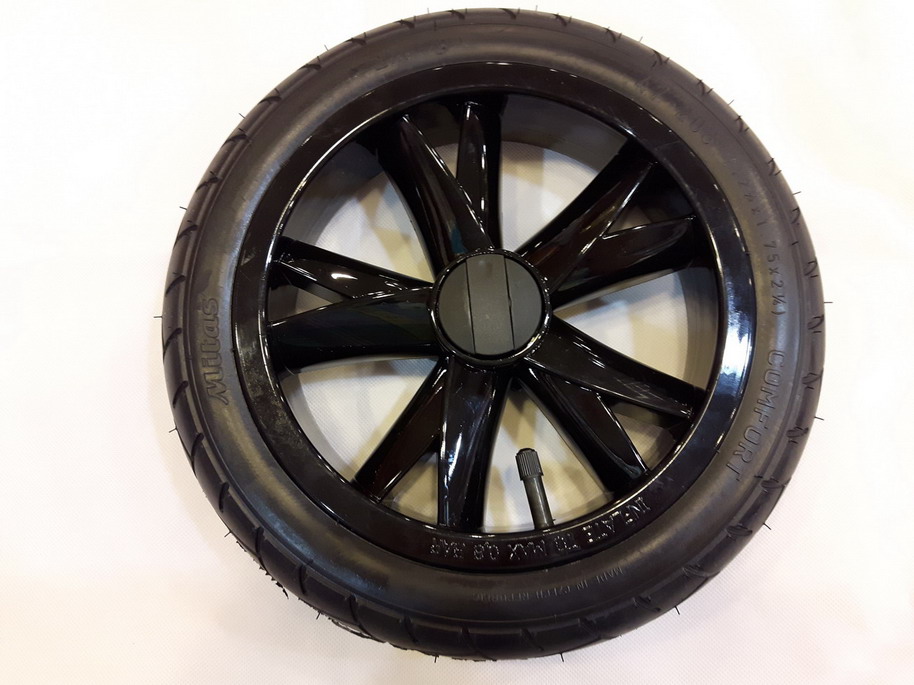 Kompletne kółko tylne na plastikowej feldze typu "Nożyce" w kolorze czarnym. Piasta jest podwójnie łożyskowana, co zapewnia trwałość i lekkość prowadzenia wózka.