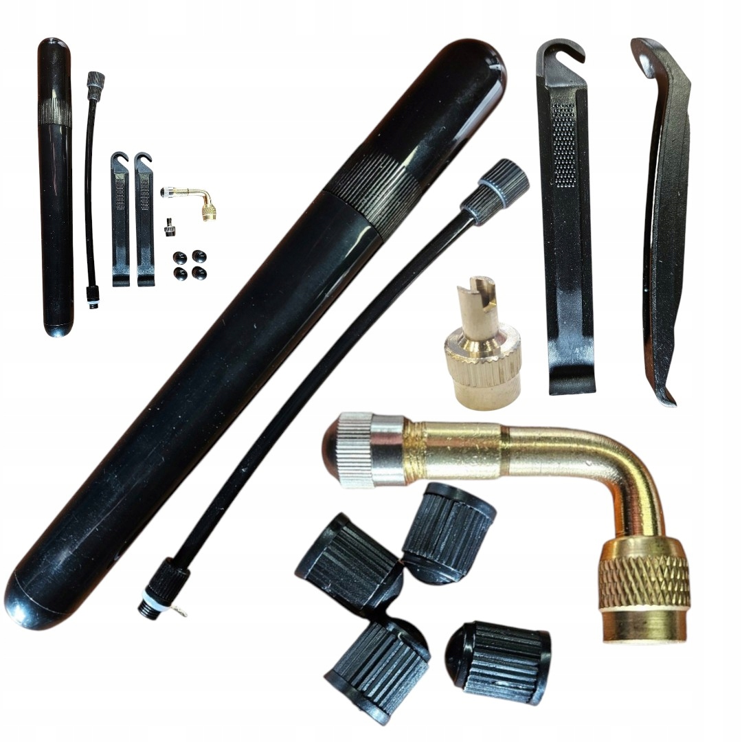 Niezbędne narzędzia do naprawy i wymiany opon i dętek w kółkach. Łyżki do ściągania opon zapobiegną porysowaniu obręczy, przedłużka tzw. gięty wentyl pomoże napompować kółko z trudno dostępnym wentylem. Odpowiednia pompka z wężykiem pozwoli odblokować zawór w wentylu do pompowania - dasz radę napompować kółko w wózku. Nakrętka na wentyl z kluczykiem pozwoli Ci dokręcić zaworek w wentylu.