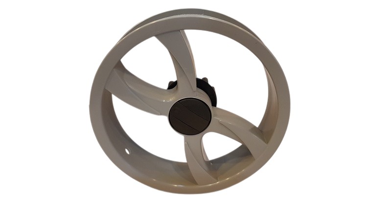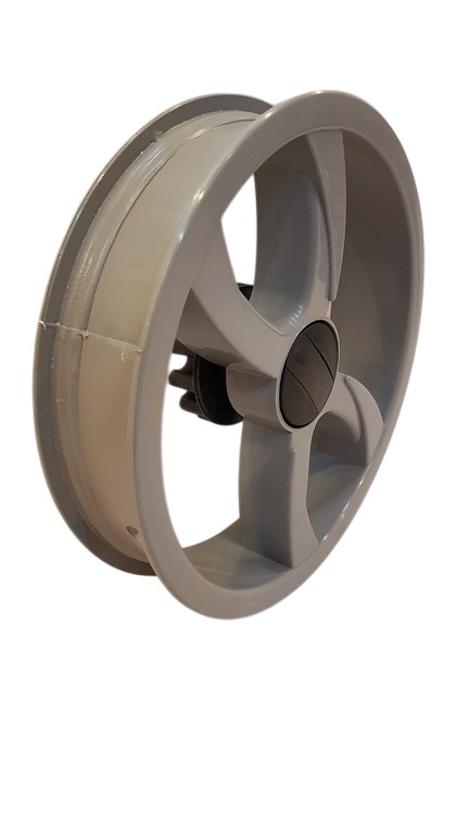 Plastikowa felga tylna w kolorze szarym, montowana na łożyskowanej piaście. Wyposażona w zintegrowaną zębatkę hamulca, zapewniającą pełną kompatybilność z systemem hamulcowym Twojego wózka.
