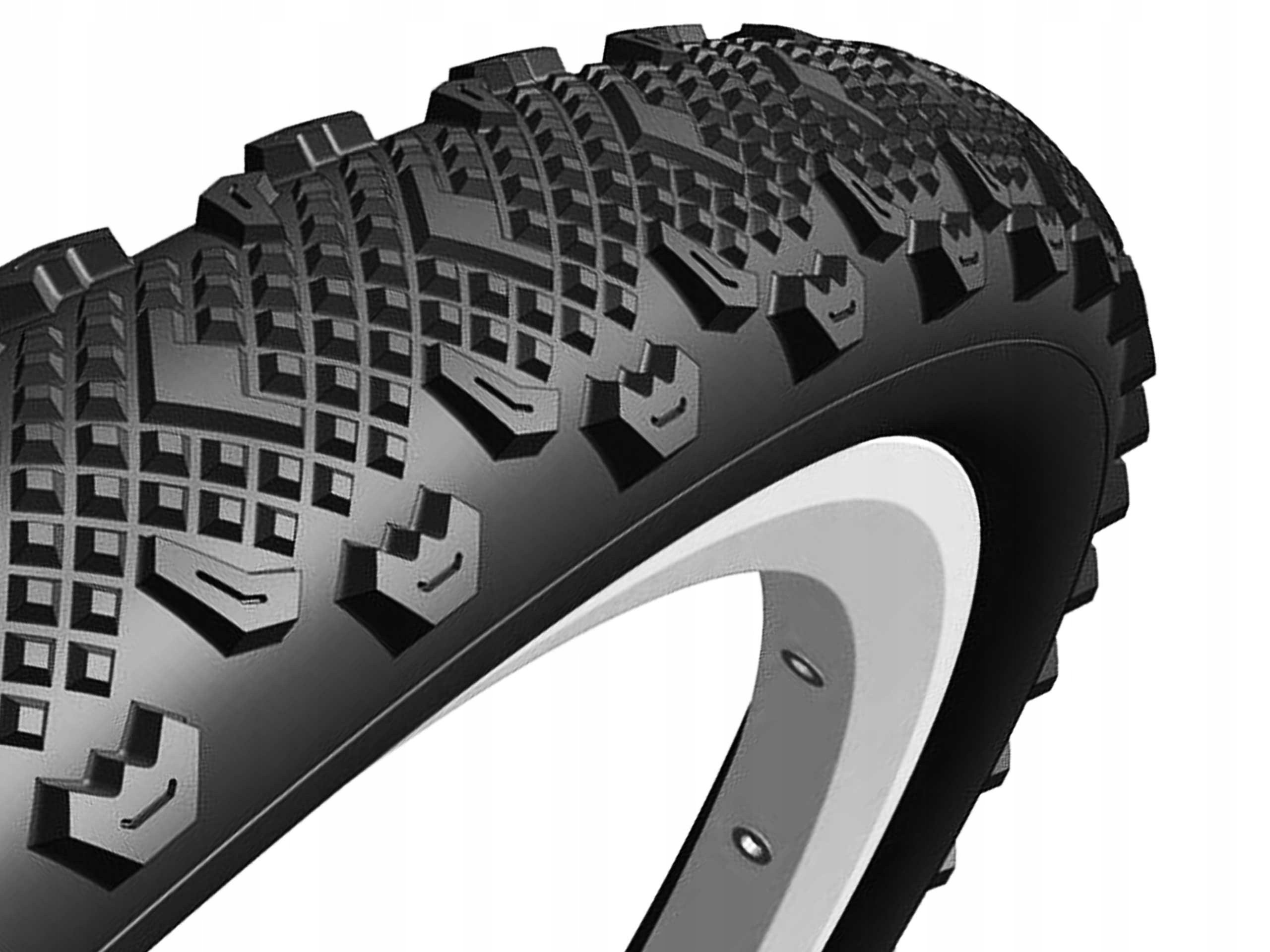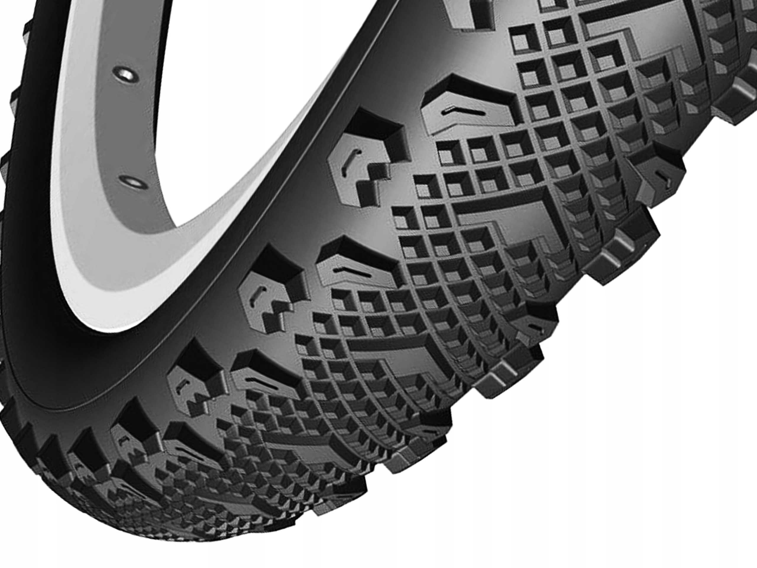 Środkowa sekcja bieżnika posiada gęsto ułożone klocki, które minimalizują opory toczenia na asfalcie. Boczne, dwurzędowe klocki wchodzą do gry w zakrętach i na miękkim podłożu, dbając o stabilność.