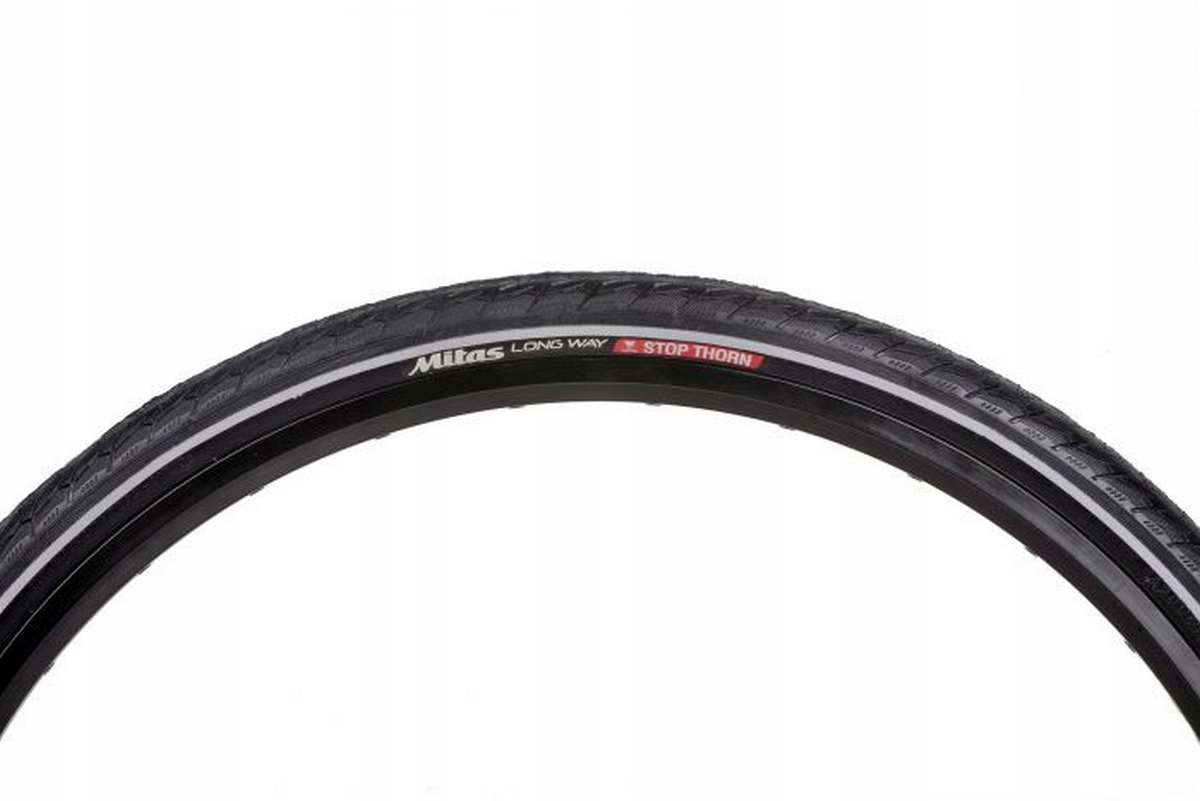 Stop Thorn: Pod bieżnikiem znajduje się potężna taśma z twardej gumy o grubości 3,5 mm. Chroni ona dętkę przed ciałami obcymi, jednocześnie zwiększając sztywność opony, co poprawia jej właściwości jezdne przy pełnym obciążeniu sakwami.