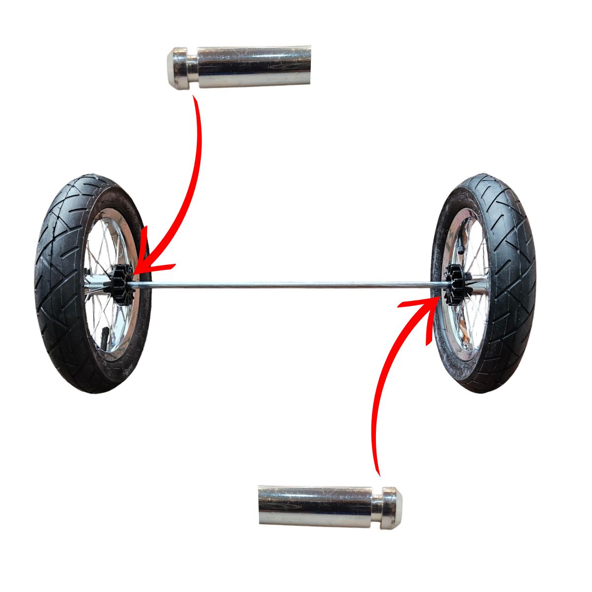 Oś stalowa umożliwia zamontowanie dwóch kół po przeciwnych stronach osi.