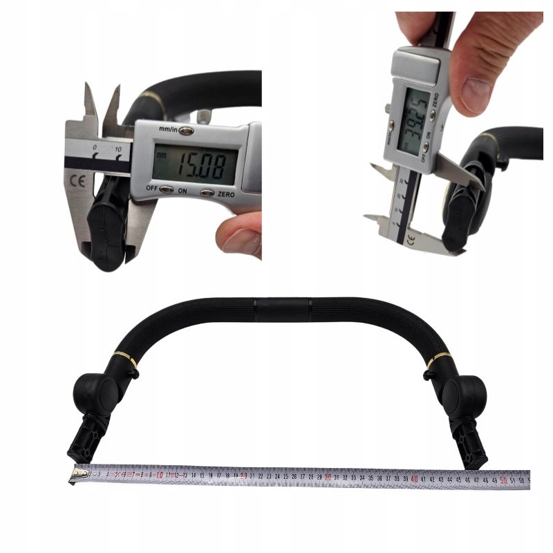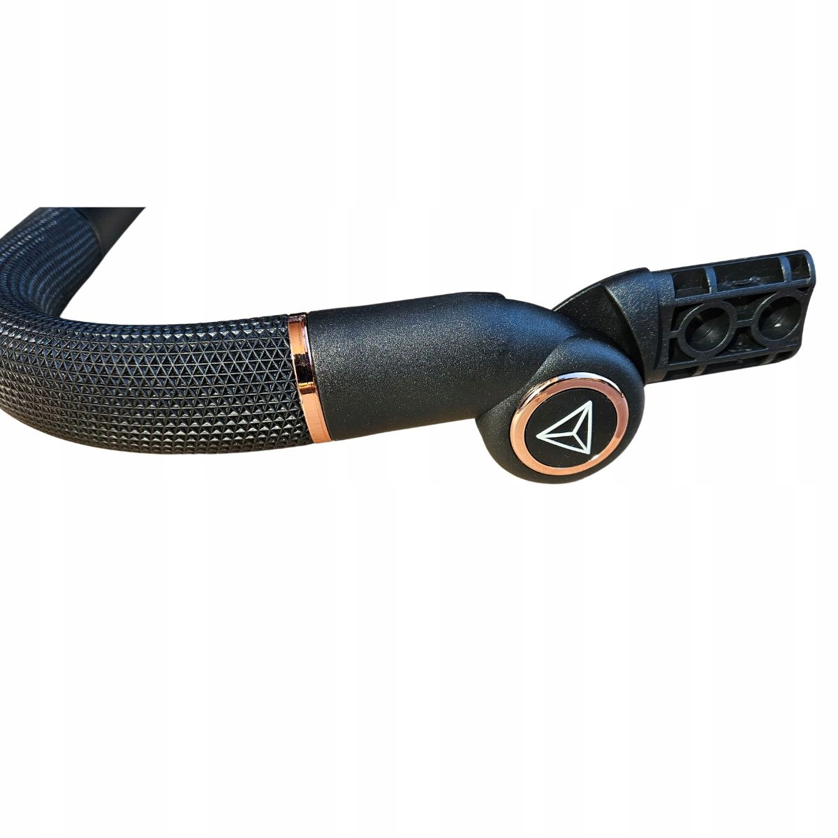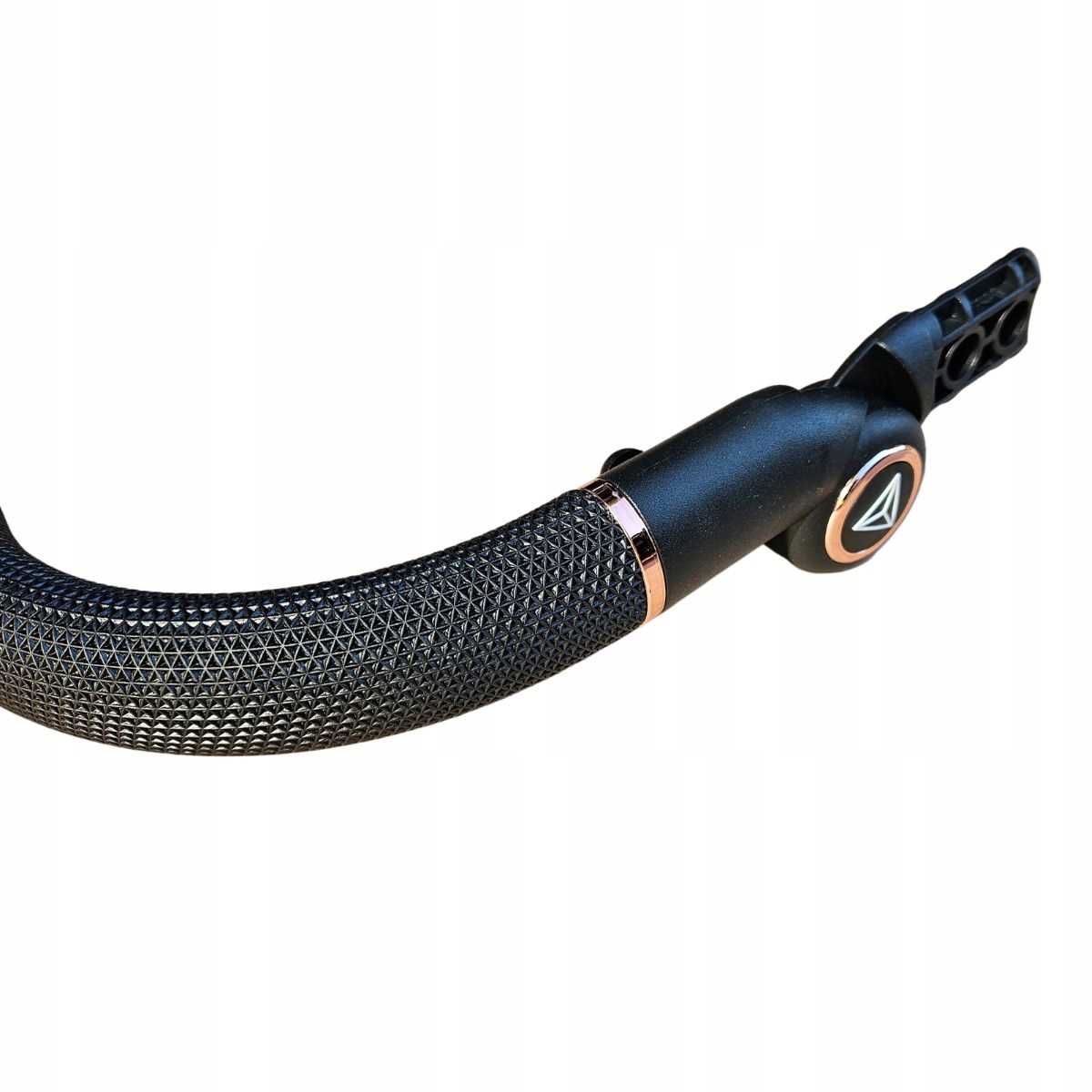 Oryginalna, fabrycznie nowa rączka dedykowana do wózków **Junama Diamond** oraz innych modeli tej marki o szerokości stelaża 47cm. Wykonana z eleganckiej, czarnej ekoskóry, wzbogacona o stylowe detale w kolorze **Rose Gold (miedź)**.