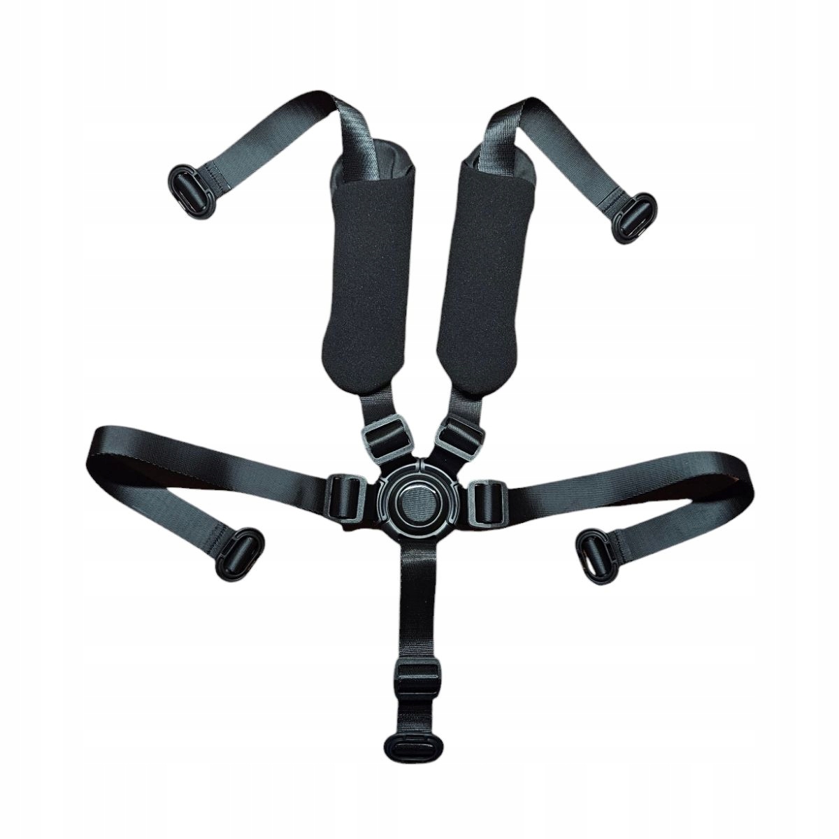 Oryginalne szelki bezpieczeństwa stosowane fabrycznie w wózkach **Roan Bloom** oraz pierwszej generacji modelu **Roan Ivi (1.0)**. Ten konkretny model wyróżnia się zastosowaniem unikalnych, półokrągłych przelotek wciskanych, które gwarantują stabilne połączenie pasów naramiennych z biodrowymi. Zestaw jest kompletny i zawiera czarne poduszki ochronne, które dbają o komfort dziecka podczas codziennych spacerów.
