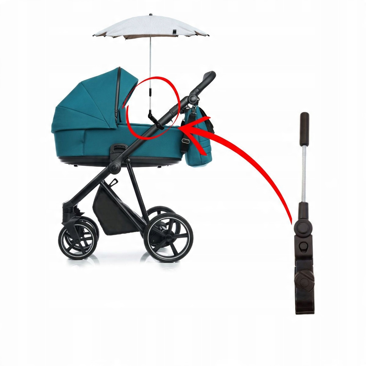 Wystarczy parasolkę mocno wcisnąć w tuleję do osadzania parasolki i zamontować uchwyt przy stelażu wózka.