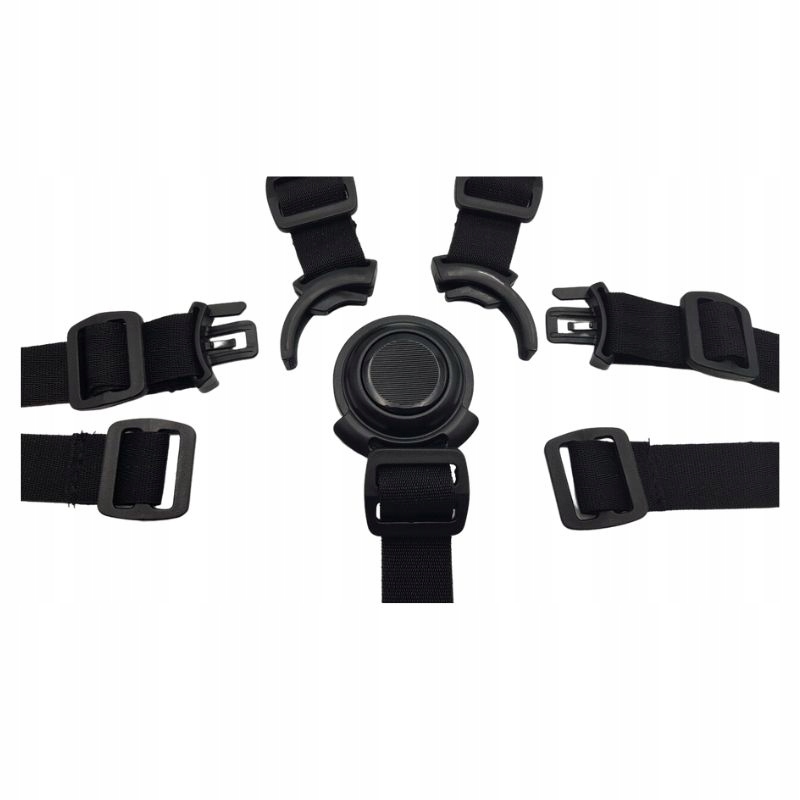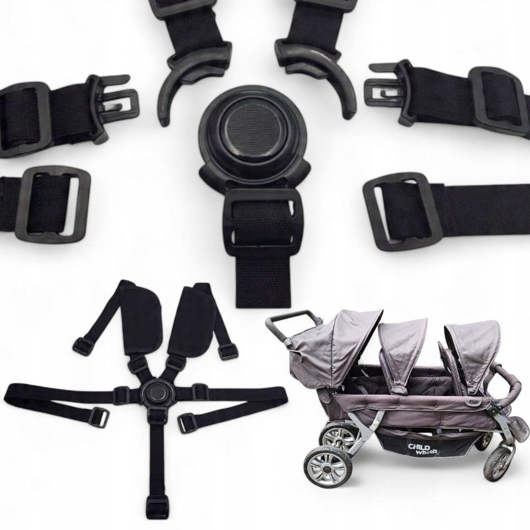W wózkach wieloosobowych pasy są eksploatowane kilkukrotnie częściej niż w standardowych spacerówkach. Aby przedłużyć życie klamry, raz na miesiąc przetrzyj ją wilgotną ściereczką – usunięcie okruchów i kurzu zapobiegnie zacinaniu się mechanizmu. Pamiętaj, aby zawsze stosować dołączony **pas krokowy**; to on jest kluczowy dla zachowania geometrii 5-punktowej i uniemożliwia dziecku wysunięcie się dołem pod pasami biodrowymi.