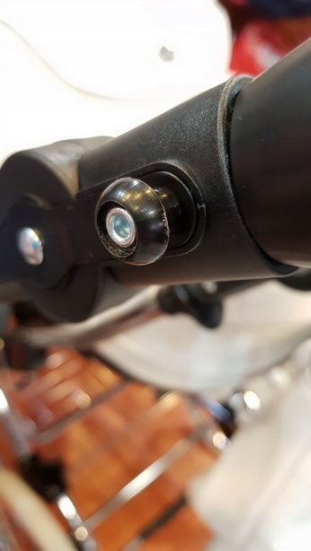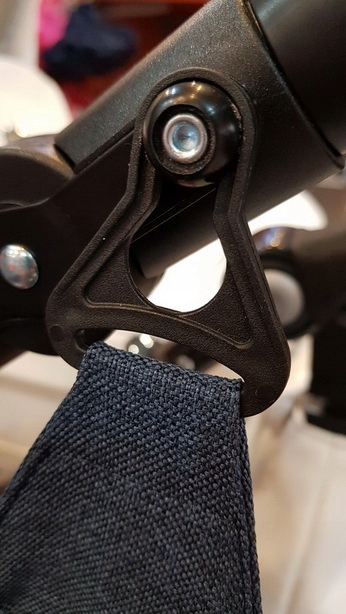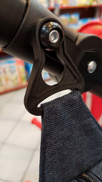 Uchwyt posiada specjalnie wyprofilowany otwór (tzw. oko), który nasuwa się na fabryczne bolce montażowe znajdujące się na rączce wózka. To rozwiązanie jest znacznie trwalsze od rzepów – raz zamontowane, trzyma torbę w stałej pozycji.