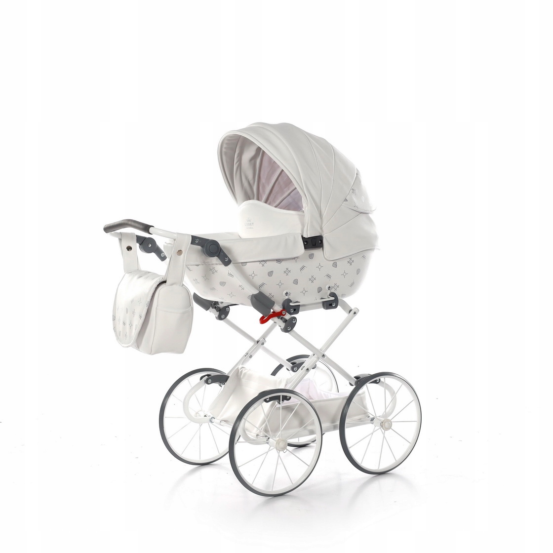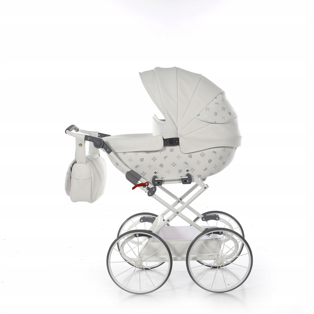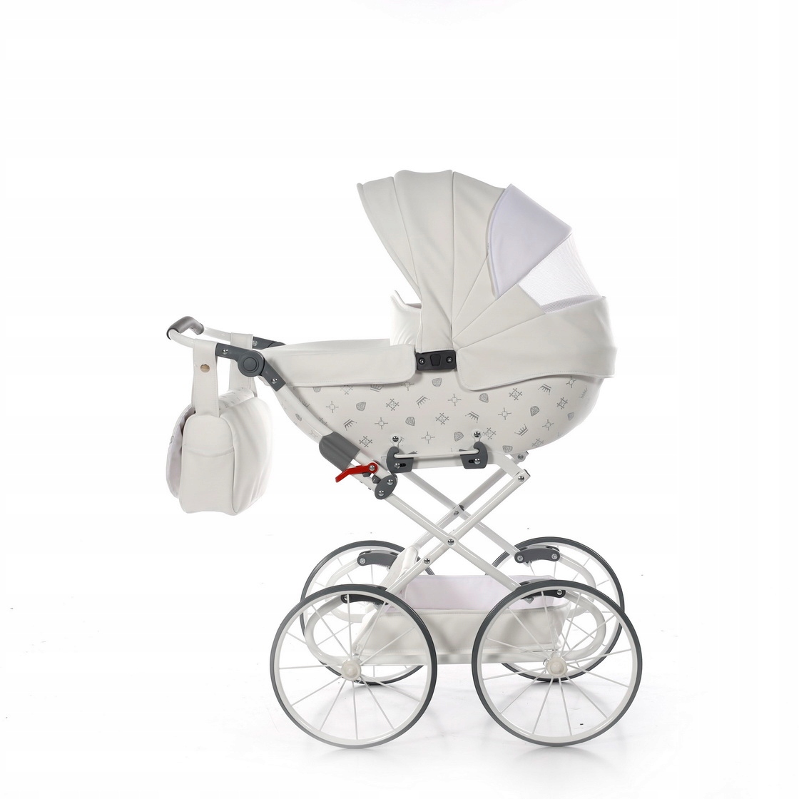 Model IMPERIAL Mini 01 w wersji ze srebrnymi detalami to połączenie nowoczesności z klasyczną formą wózka retro. Wykonany z luksusowej, białej eko-skóry, prezentuje się niezwykle lekko i elegancko.