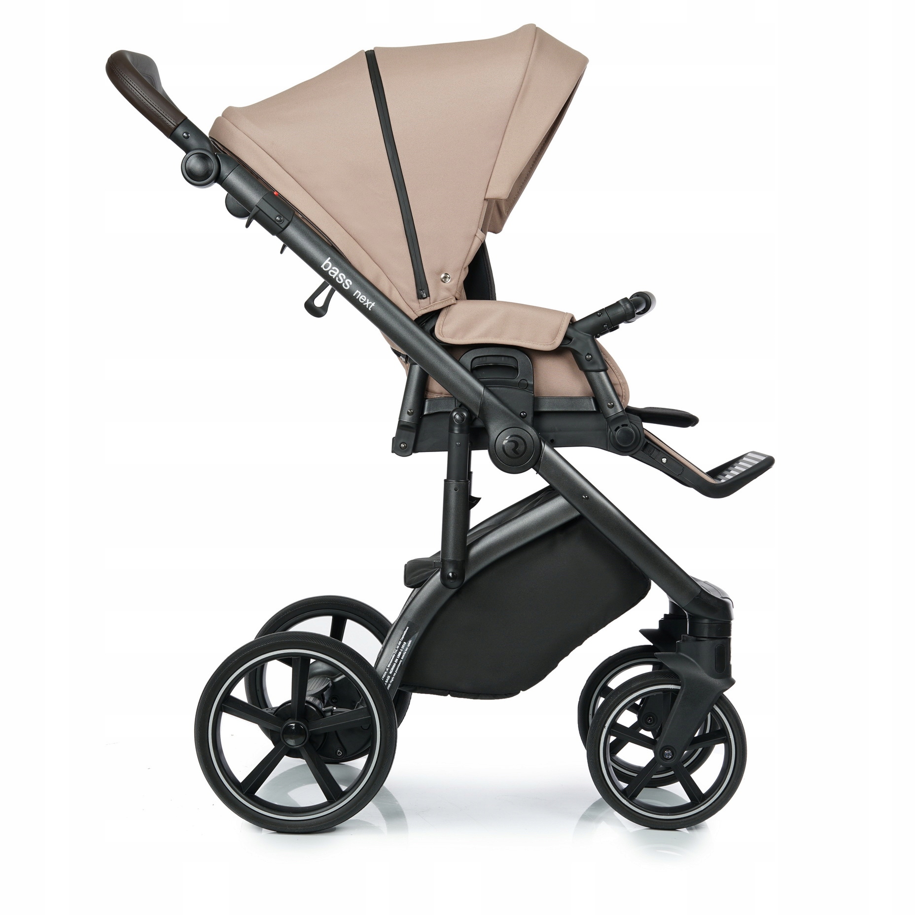 Wózek Bass Next w odcieniu Amber to połączenie nowoczesnego stylu z doskonałą amortyzacją. Aluminiowy stelaż wyposażony w system SOFT (dodatkowy amortyzator z blokadą) gwarantuje płynność jazdy nawet na nierównym terenie.